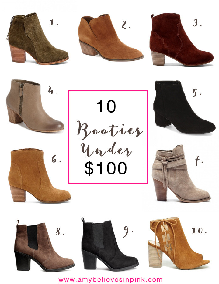 This post is dedicated to all of the questions about inexpensive booties I receive during this time of year. Whether you’re pairing them with skinny jeans for a night out or with a sweater dress for class, booties are one of the most versatile and well-loved staples of your fall wardrobe. But because they’re worn so often and you probably want multiple colors (#it’sthetruth), I rounded up 10 options under $100 so you can justify expanding your bootie collection…