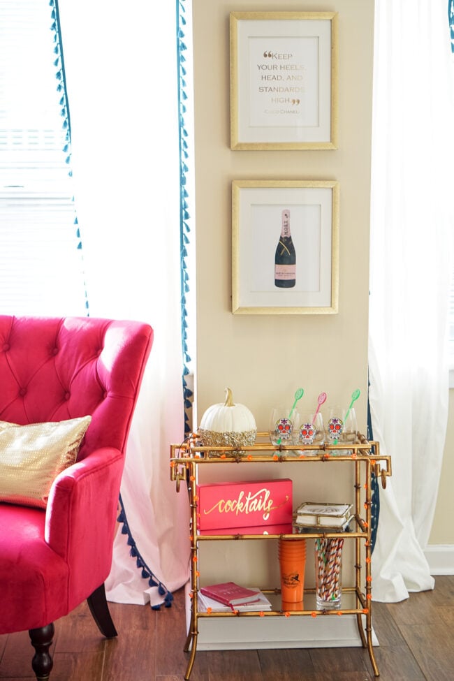 Décor Details: fuchsia chair: World Market // curtains: T.J. Maxx {similar here} // bar cart: Lulu & Georgia {SO worth the price!} // “cocktails sign”: HomeGoods // glitter pumpkin: similar here // polka dot glass: Kate Spade // stripe straws: HomeGoods {similar here} // gold bamboo napkin holder: Emily McCarthy {check my name as a reference when you checkout on this site!} // napkins: similar here // skull wine glasses: HomeGoods {similar here} // ‘Drink Up Witches’ cups: {similar here} // “Little Pink Book of Cocktails”: Amazon // “All You Need is Love… and a Bottle of Wine” sign: Amazon // Chanel quote & champagne print: these were a graduation gift to me from my Big 😉