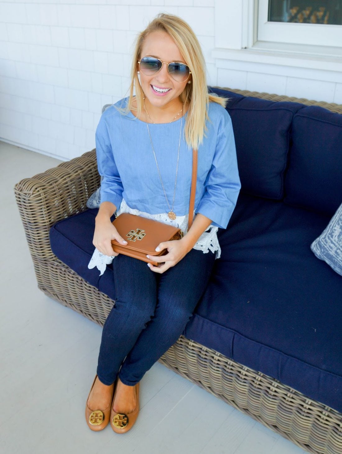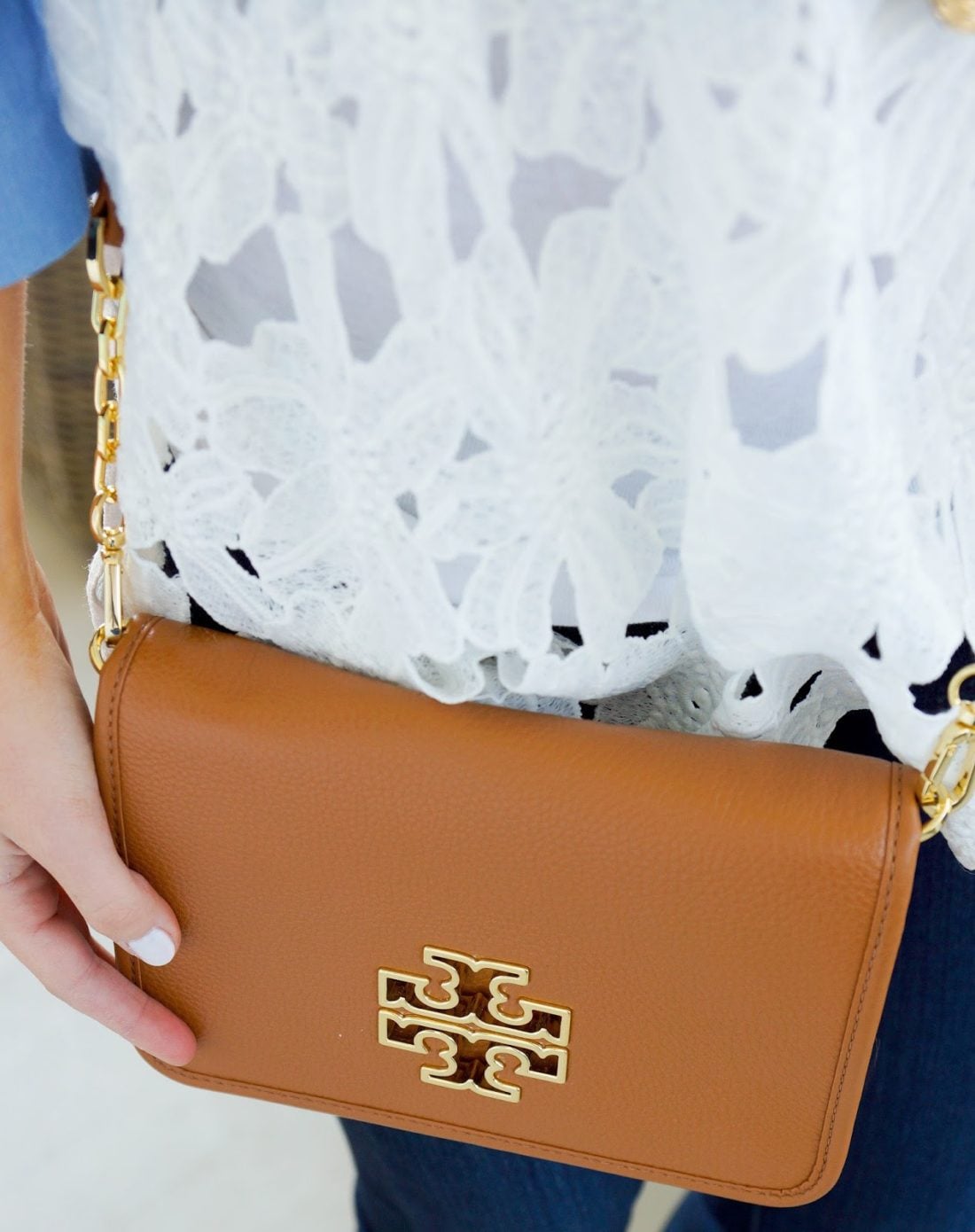 This outfit is everything that a spring outfit should be– light, breezy, and full of pretty little details (hello lace & gold accents)! I am all about investing in simple, classic accessories like my long monogram disk necklace (I throw this over everything) and the Tory Burch Britten crossbody bag! Accessories like these dress up any ensemble, even a simple t-shirt, and automatically make you look more polished and put together. They are definitely staples that are worth it– and would make the best graduation or spring birthday gifts (share this post with your mom for a little hint hint)!