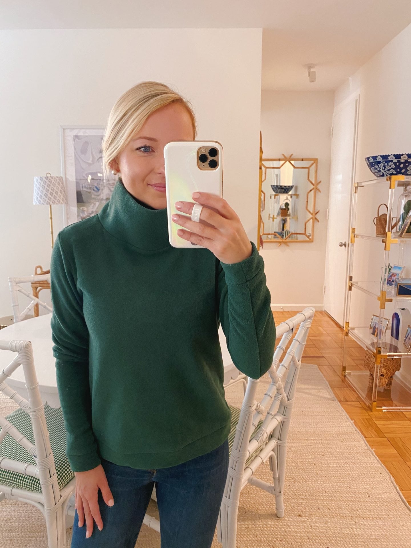 I would go with one of their iconic turtlenecks! They launched the brand with this signature style and they’ve become an absolute wardrobe staple of mine. Something about the structured neck and slim silhouette elevates them and sets them above any other fleece pullover. Throw your hair in a bun, add some statement earrings and sneakers or boots, and you’re good to GO. Beyond easy, chic, and comfortable.
