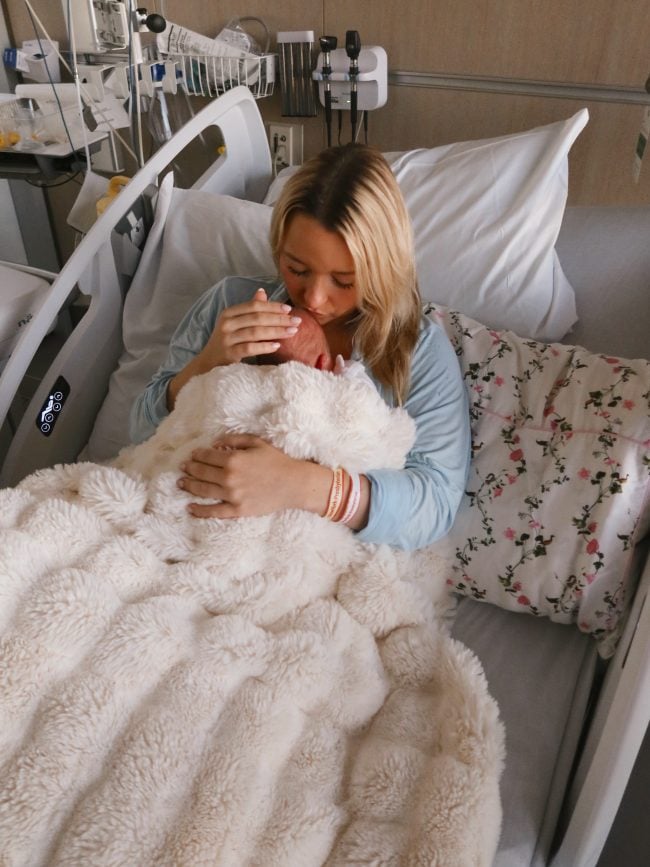 That’s when things took a turn– after they stitched up my incision, I started really bleeding from my uterus and the mood in the room shifted. I went in and out of consciousness but knew it was an emergency and that I was hemorrhaging. People were scrambling, nervous, and someone actually used the word “emergency” to me. I guess my uterus continued to have contractions after they had stitched me up, so I was losing a lot of blood and had to get a balloon (again, I don’t know what the exact medical term is) inserted into my uterus so it would stop hemorrhaging. Poor Johnny saw this all go down and then had to leave the operating room at this point, and spend a considerable amount of time walking the hospital halls with our new baby, not knowing if I was ok. He told me later that Molly didn’t make a peep the whole time. Again, she’s such an unproblematic queen (it’s me who caused all the issues!!).