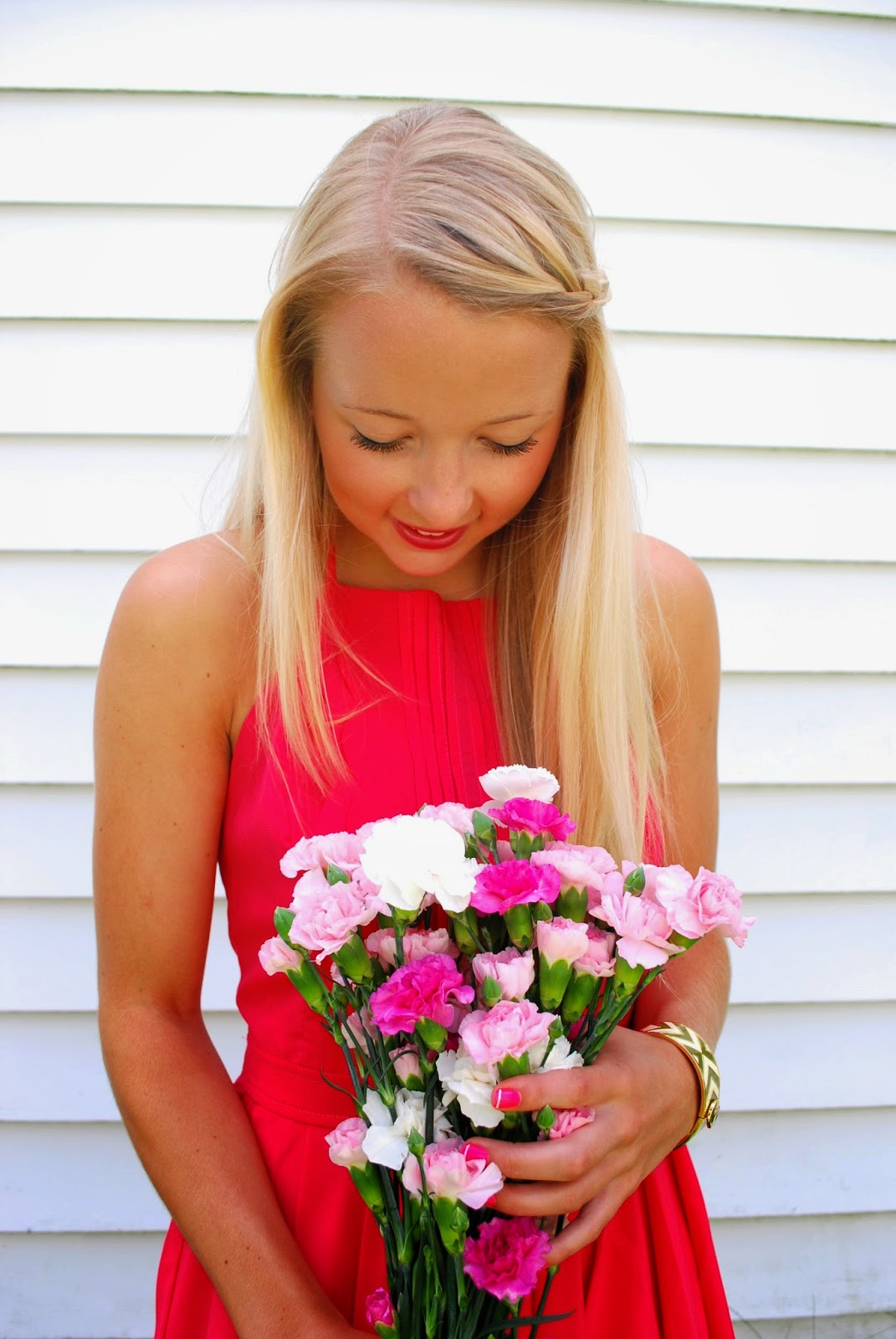 July is in full bloom starting tomorrow! Styling this bright pink/red halter dress with a bouquet of mini carnations that just happened to match perfectly. What better way to ring in the start of the month than with these gorgeous flowers and a flowy little sundress?!