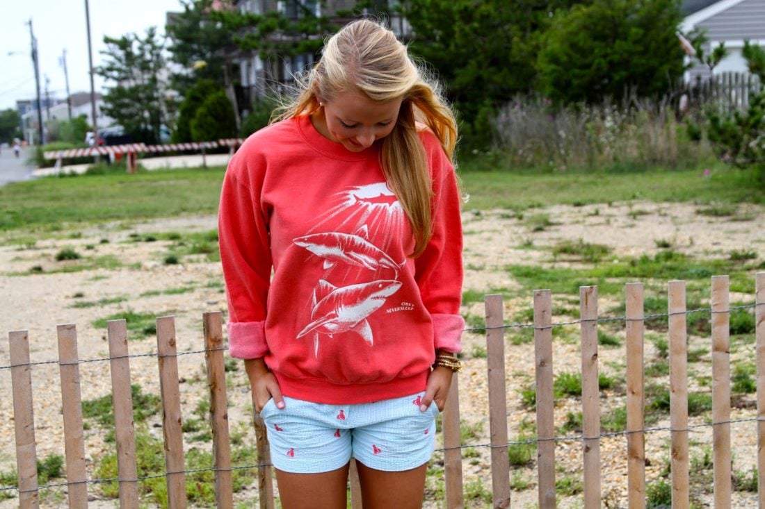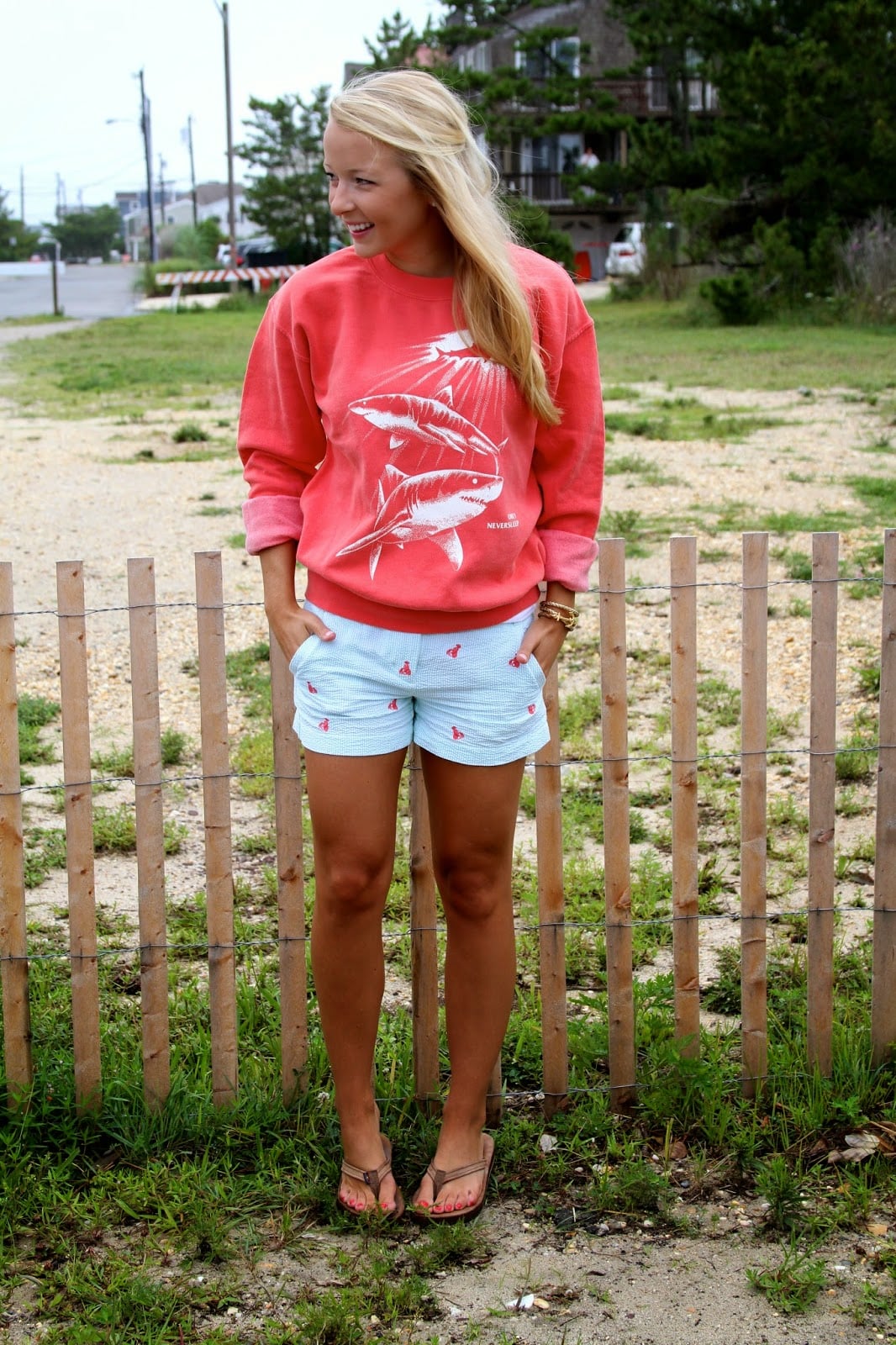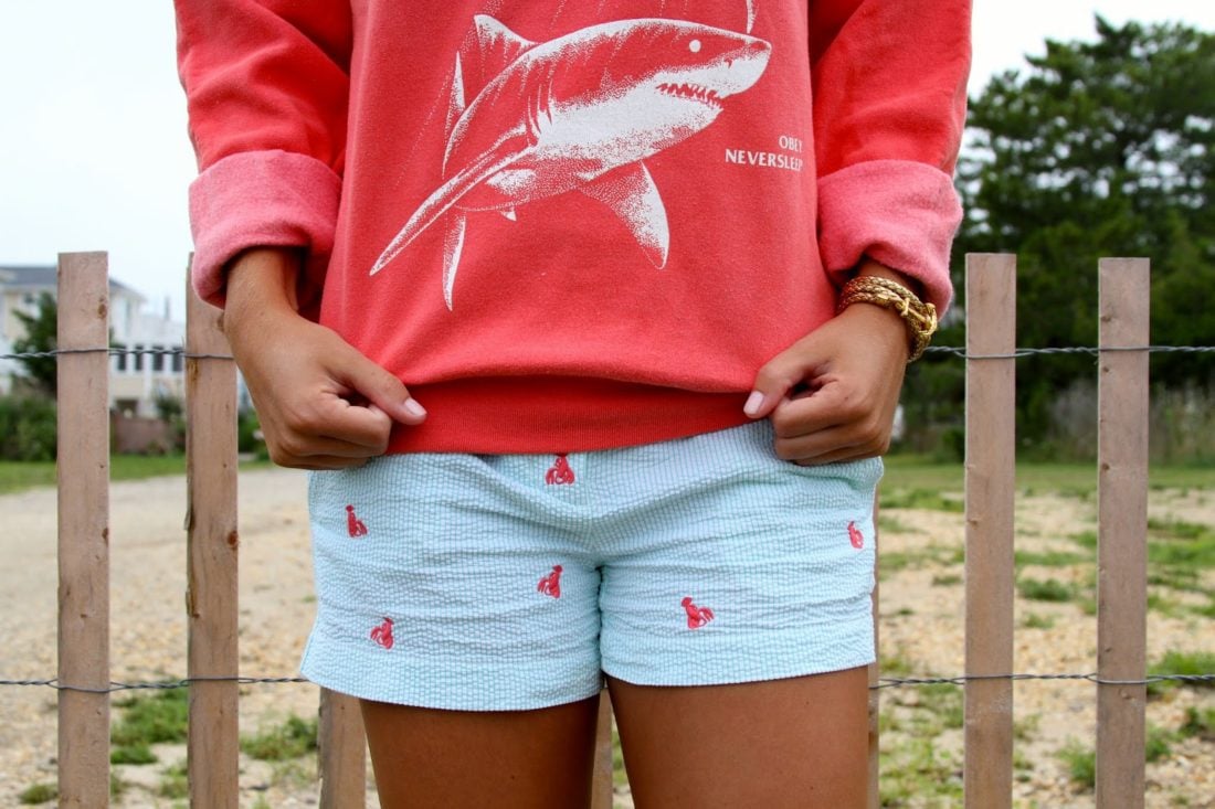 I am wearing the sweatshirt with these blue and white seersucker shorts. They have coral colored lobsters embroidered all over them– because lobsters and sharks totally go together, am I right?