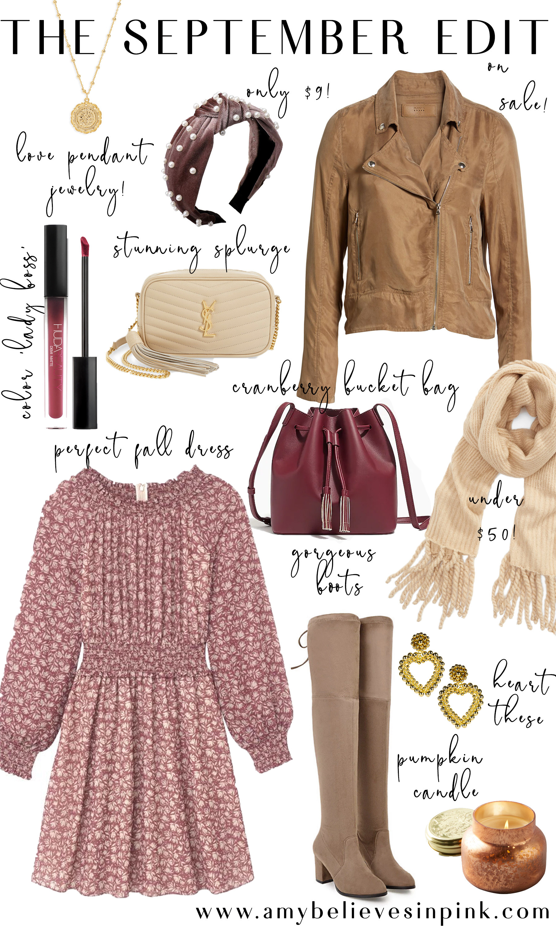 Cranberry shades meet cozy fall staples. This edit encompasses all the things that I’ve been thinking of this September… long-sleeved floral dresses, pumpkin-scented candles, blanket scarves and moto jackets, and fall trends that stand out (hello heart earrings!). I am snuggling up to all things September and bringing you along with these picks. 😊